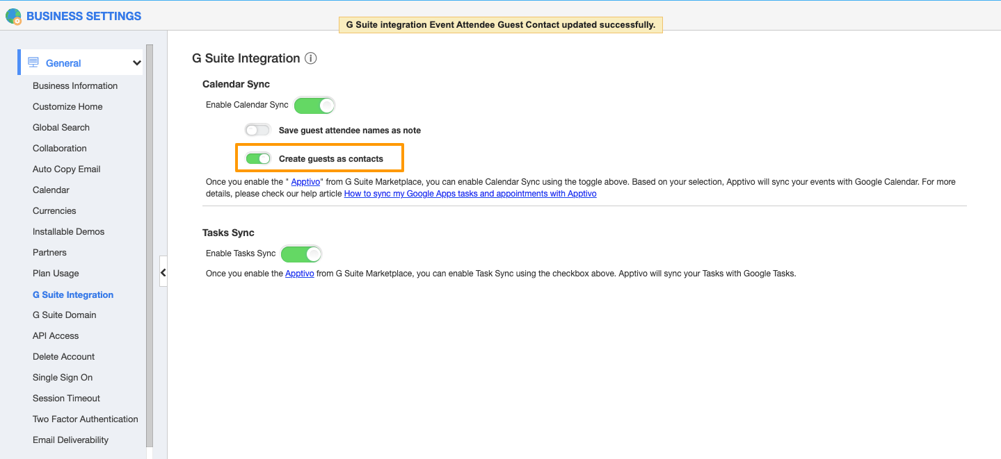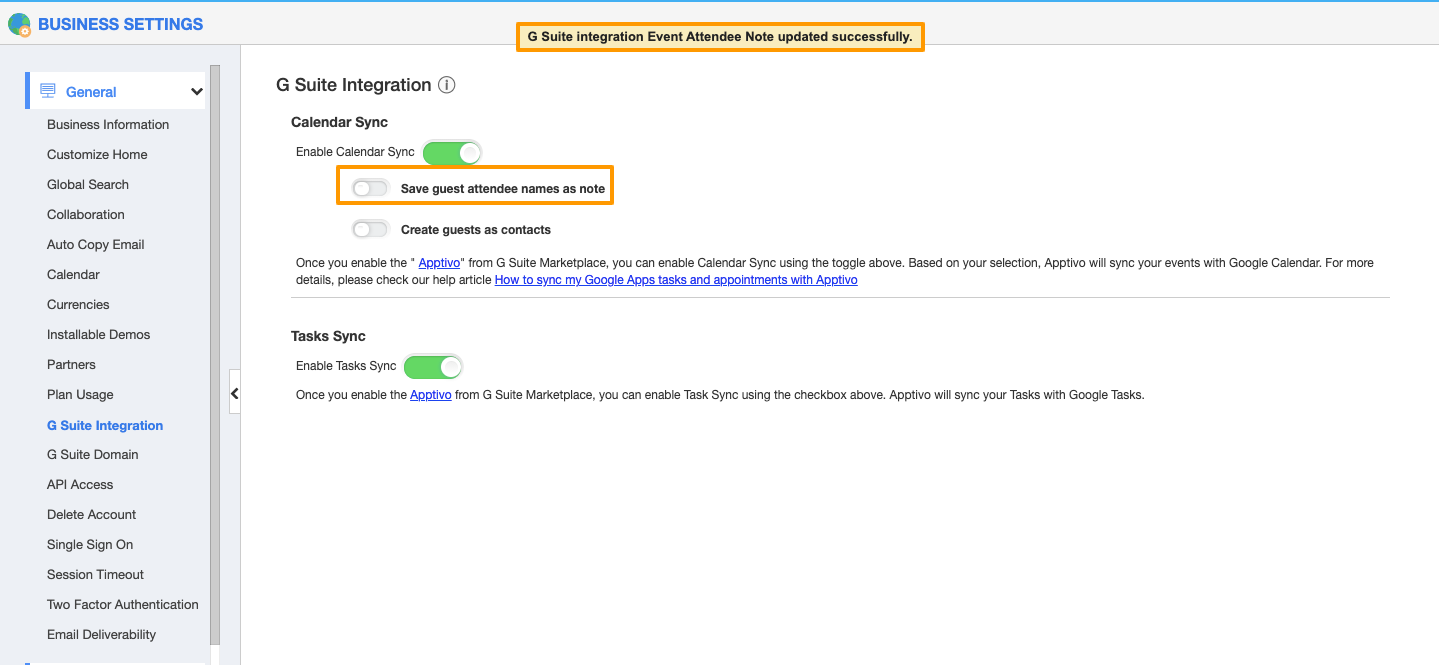 - By disabling the “Save guest attendee names as note” on the Business Settings, the event will be synced with the Apptivo but, the note will not be created.