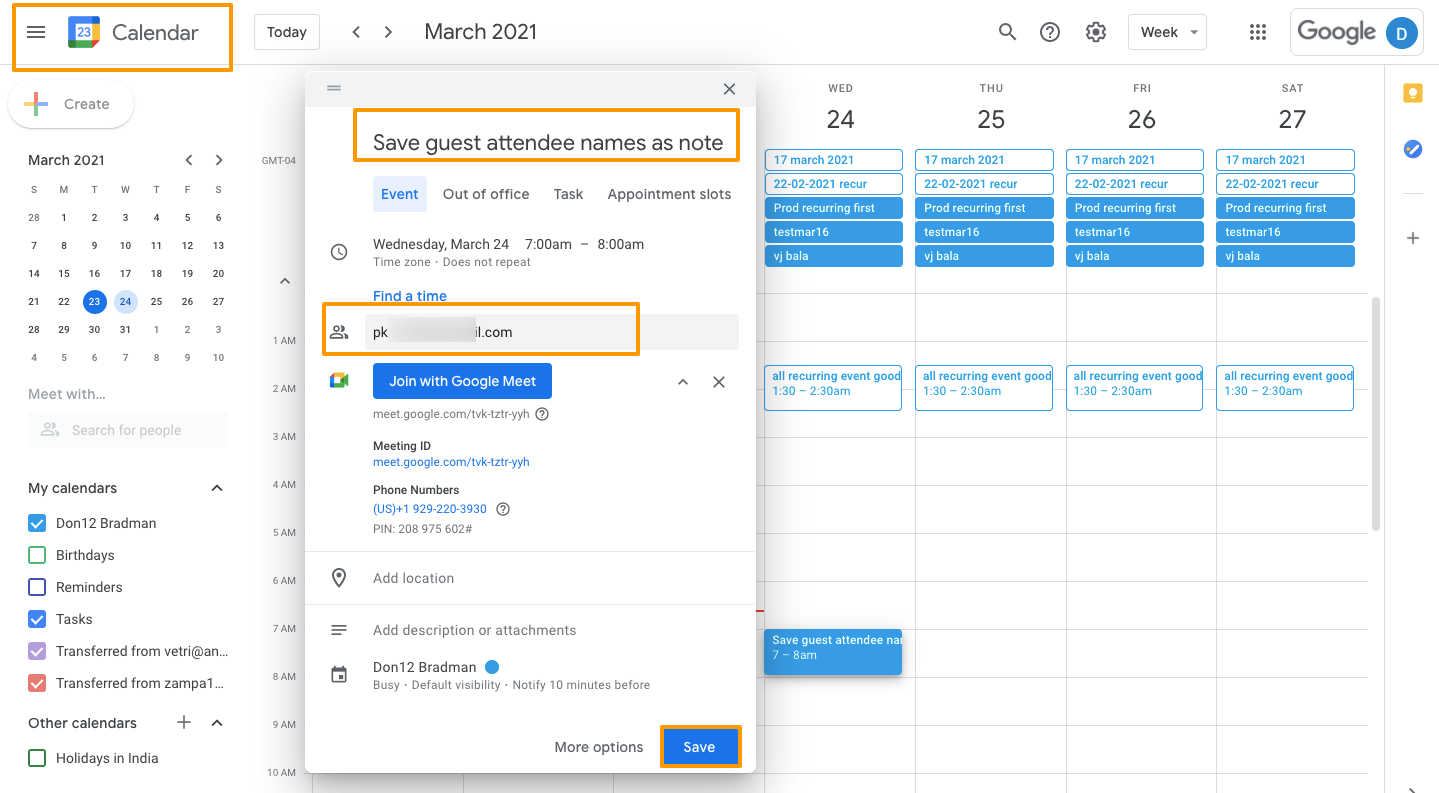 - By Default, the “Save guest attendee names as note” toggle will be disabled.