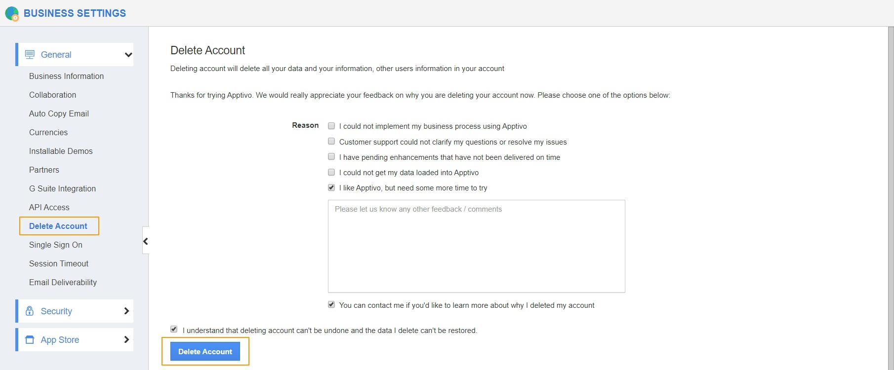 Deleting an Apptivo account using GSuite is completely trouble-free. To initiate this process, it is important to log into the Apptivo App from GSuite Marketplace.