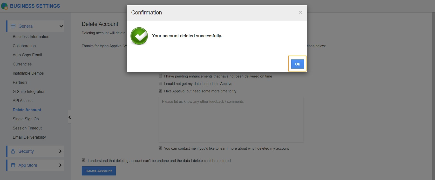 - Please note deleting your account with Apptivo does not remove it automatically from GSuite Marketplace. Hence, when you click on the Apptivo App from GSuite MarketPlace, an email will be sent automatically informing that a new account is created with your GSuite credentials.