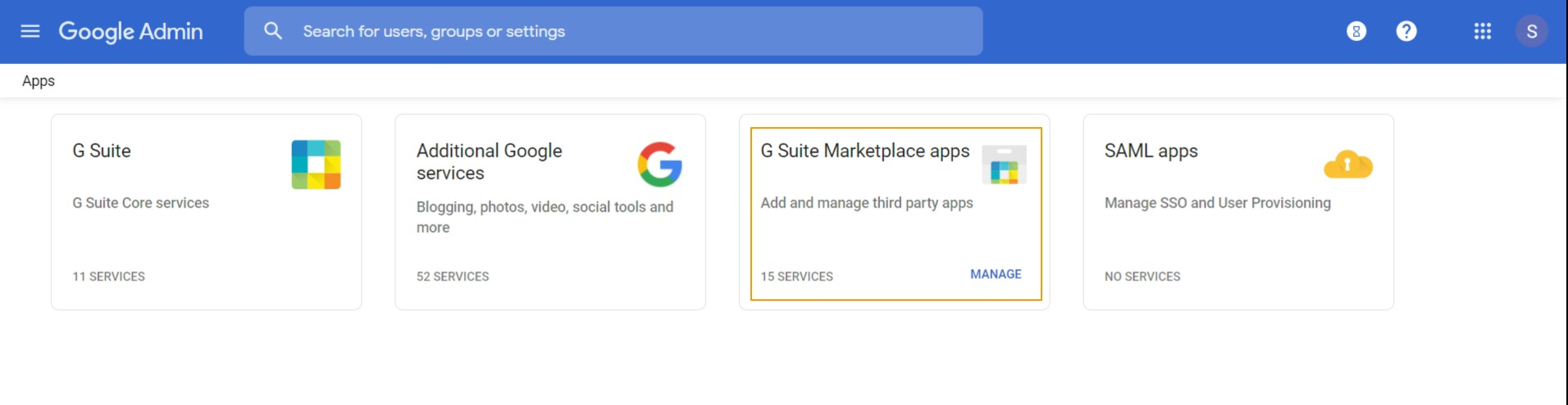- In the Admin Console, select Apps → GSuite Marketplace Apps.