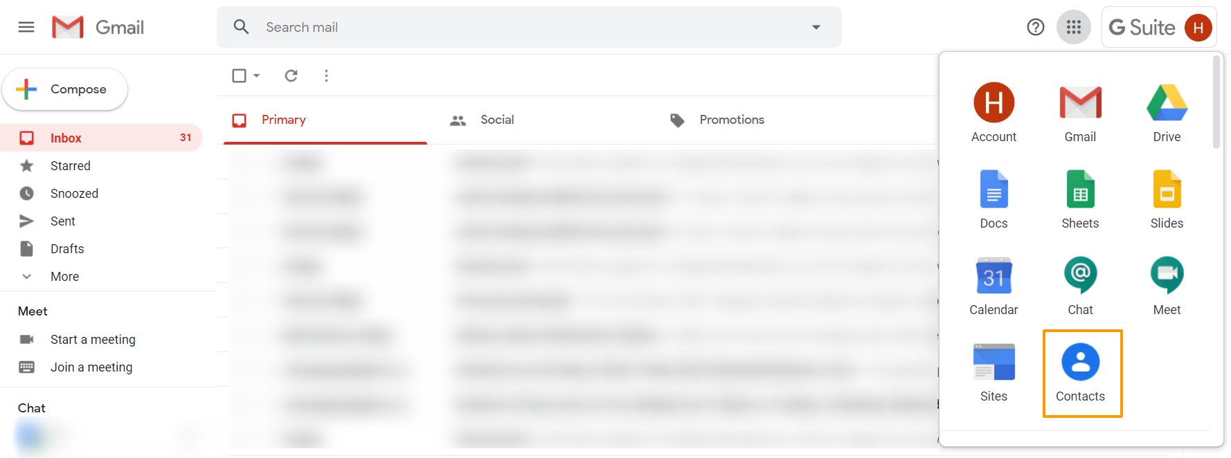 - Log into your Gmail and select Google Apps from the top right. Here, select the Contacts App of Google.