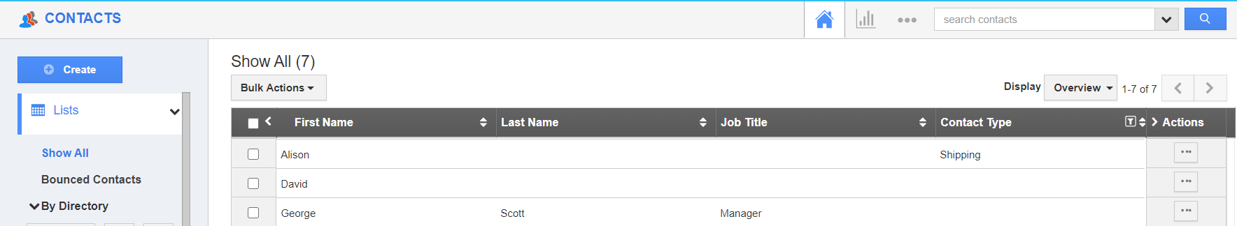 - The list of contacts synced with your Apptivo Contacts App will be listed. Select Create to create a new contact.