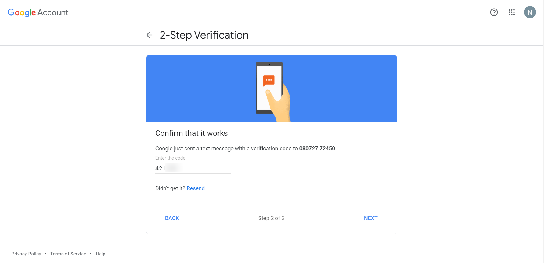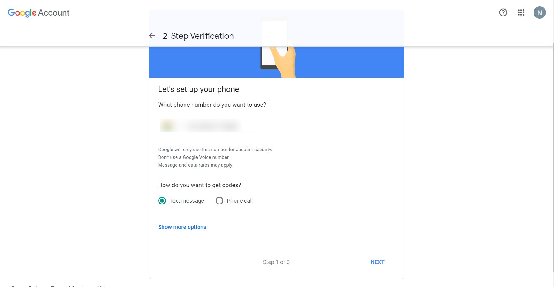 - Here, enable 2-Step Verification by adding your phone number in Step 1 and select whether you want to receive the code as a message or phone call.