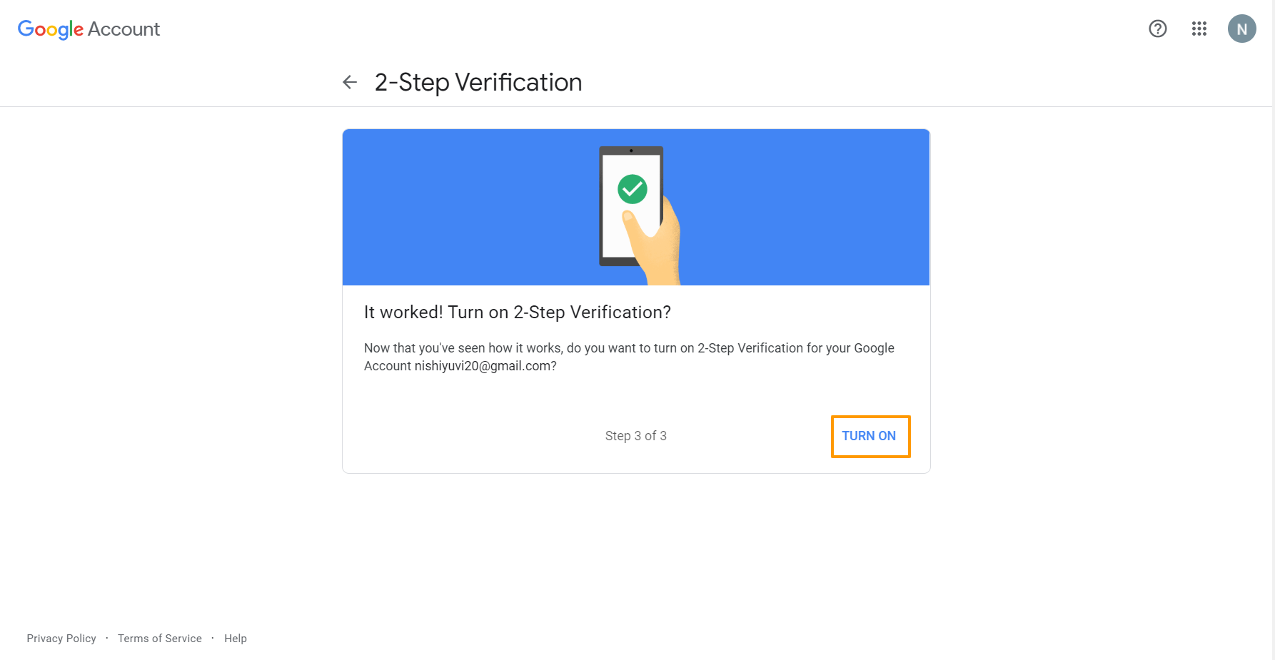 - On confirmation, you will be able to Turn On 2-Step Verification.