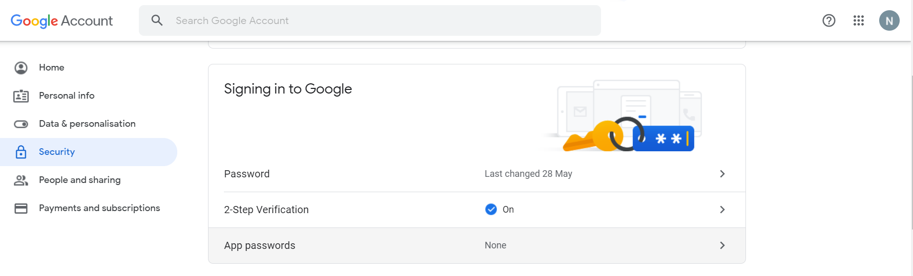 - Once the 2-Step Verification is enabled, click on App Password in the Settings page.