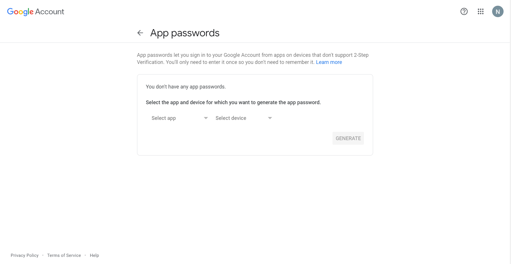 - In the App Passwords page, select the App and device.