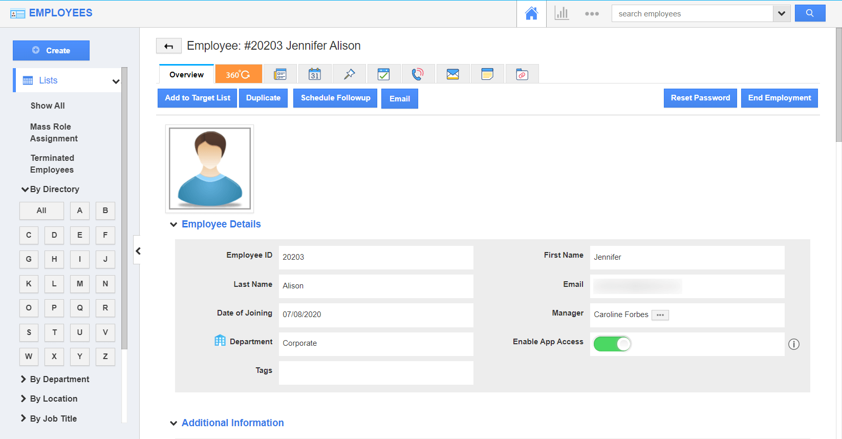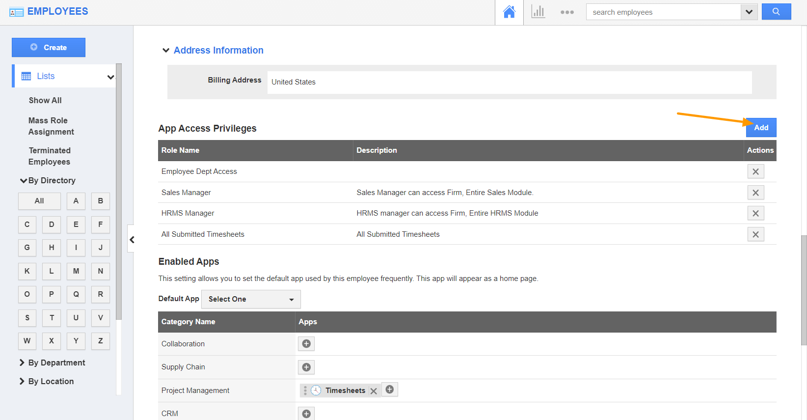 - At the bottom of the overview page of an employee, click on the "Add" button in the App Access Privileges section.