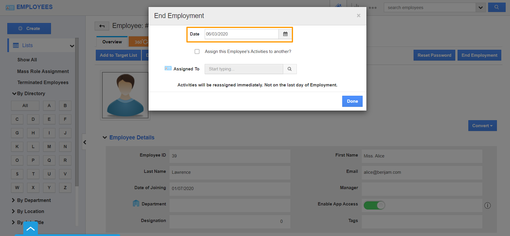 - Click on the "Done" button to end employment. The Terminated Employee will be listed in the Terminated Employees category.