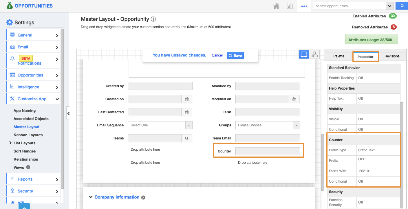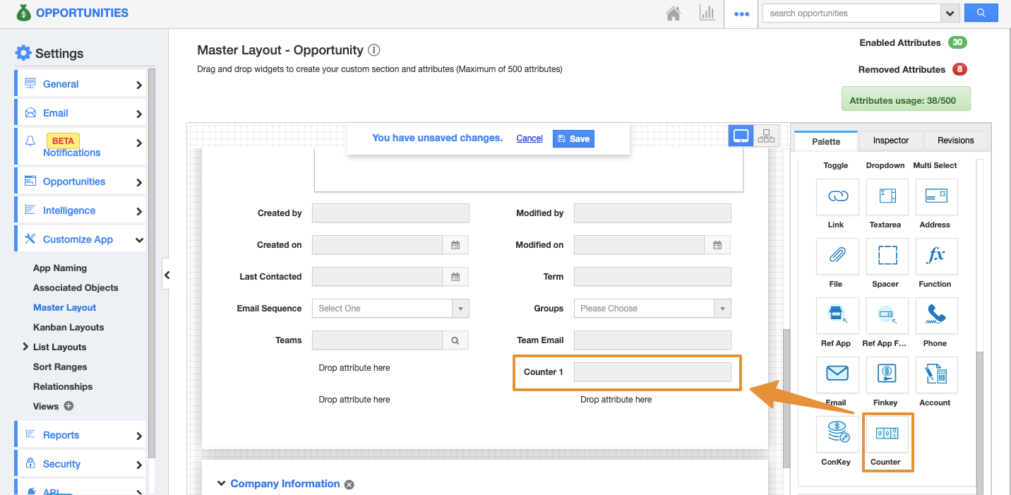 • You will be redirected to the Master layout page. Drag the Counter attribute from the "Palette → Attributes" and drop it in the place you need. For instance: Drag and drop the counter attribute to the Opportunities Information section.