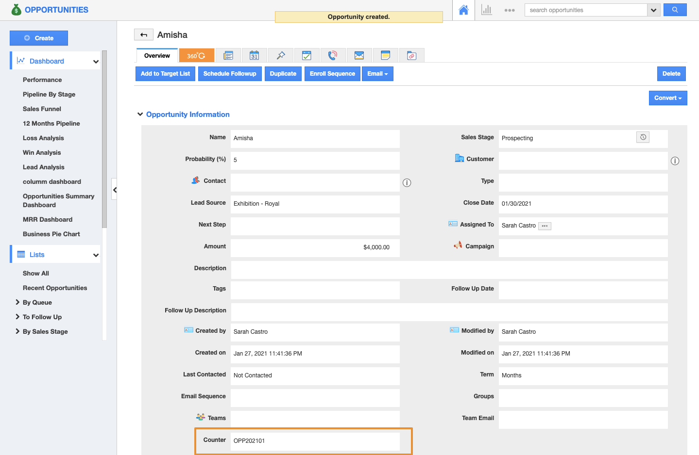 • On the creation of a new opportunity, you can view the counter attribute generated automatically with the given counter value.