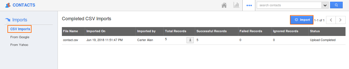 - The completed CSV file will be listed as shown in the image below, from where you will download the records using “Down arrow” icon found next to the columns(Total Records, Ignored Records, Failed Records)