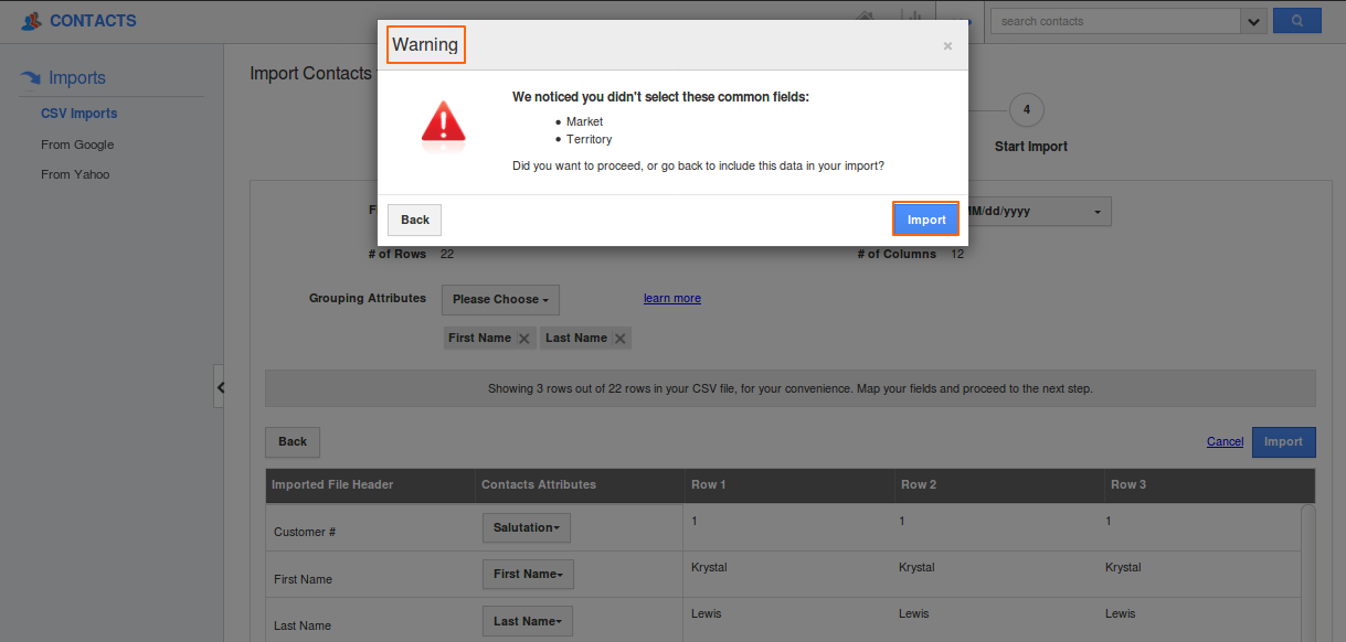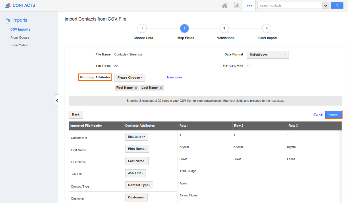 - Map contacts fields to the respective CSV fields. Select the attributes that you would like to group from “Grouping Attributes” dropdown. Make sure to map the mandatory custom fields.