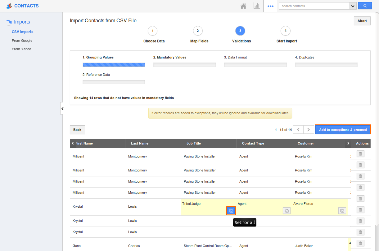 - In case of mandatory fields not having values, they are added to exceptions. If error records are added to exceptions, they will be ignored and available for download later.
