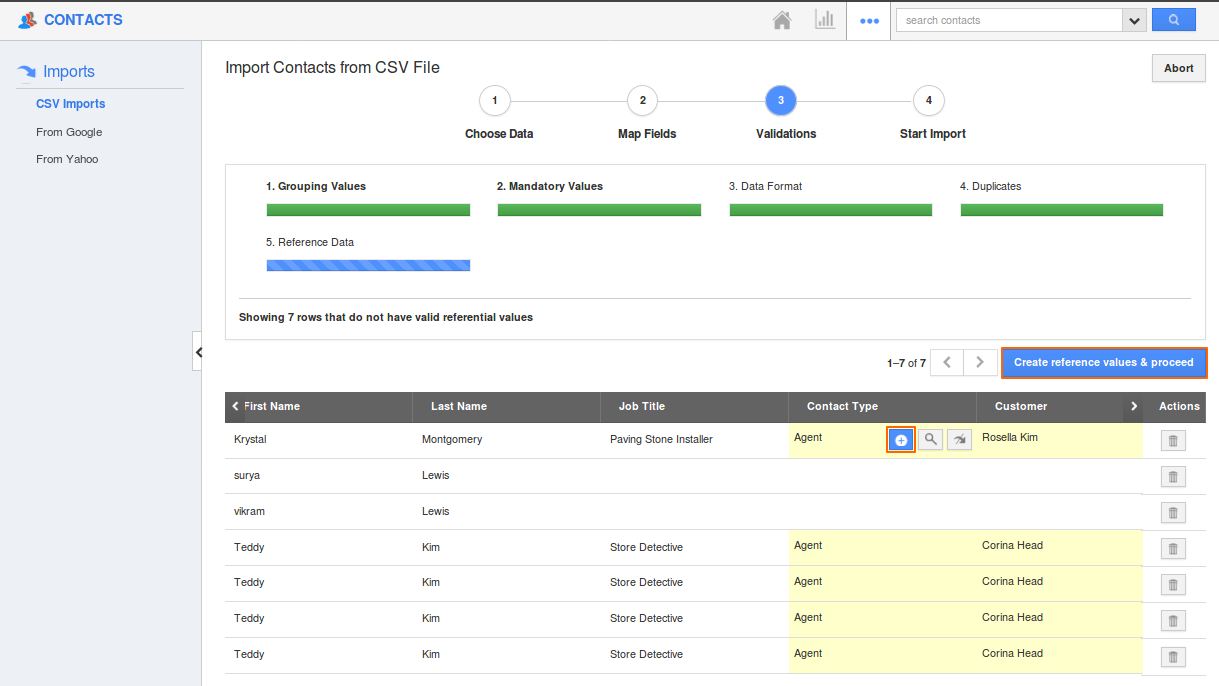 - Reference Data – Validates the association of other objects. This will associate existing objects; if there are new objects found in CSV, you are allowed to create new objects. For instance: Consider the Job Title field. If there are new Job titles in the CSV file, then you will be notified as shown in the image below. Mouse over the highlighted Job title field, where you can find the options to Create, Search, Do not Import. Click on either the "+" icon or the "Create reference values & proceed" button to create new job title at run-time, during the import.