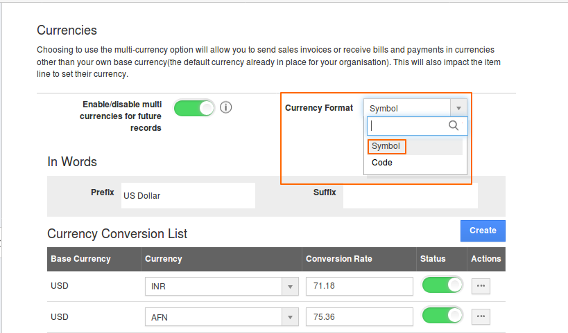 From "Currency Format" dropdown, User can change the Currency format to "Symbol" or "code" as per their requirement.