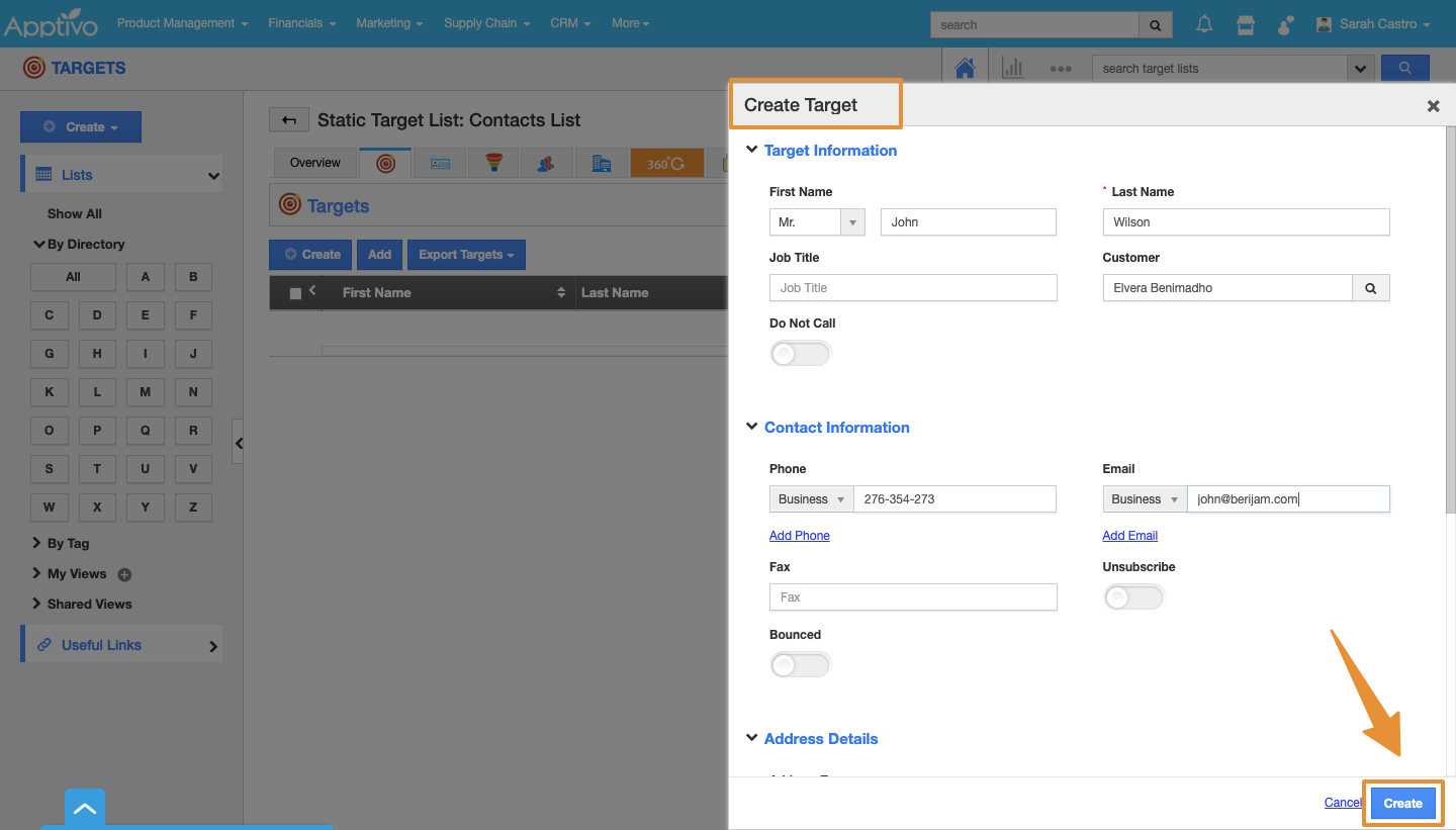 - You can view the "Create Target"popup, which provides:
