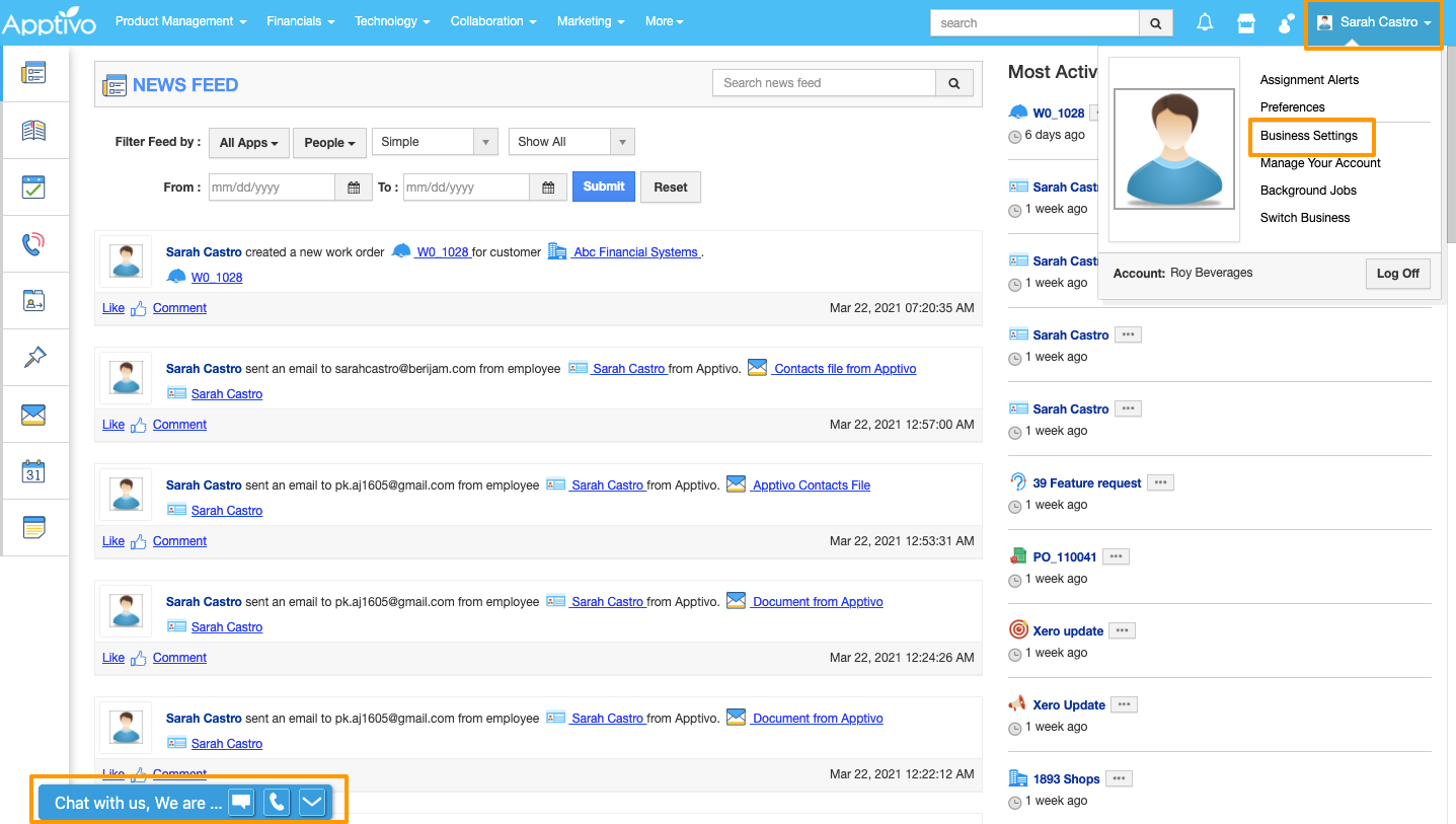 Business Settings allows you to disable or hide the Support chat popup from the account. This will entirely remove the support pop-up from the bottom of the page. You can also provide access to certain users against this support chat to view and manage this feature.