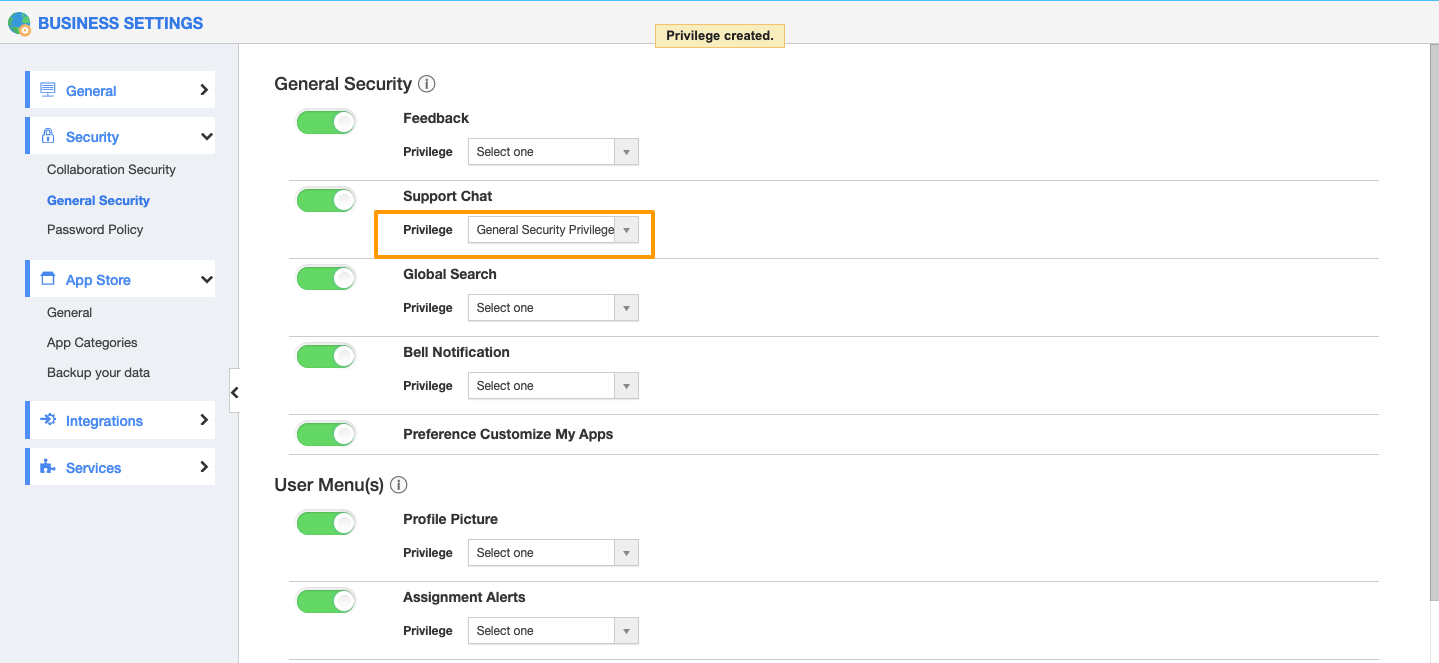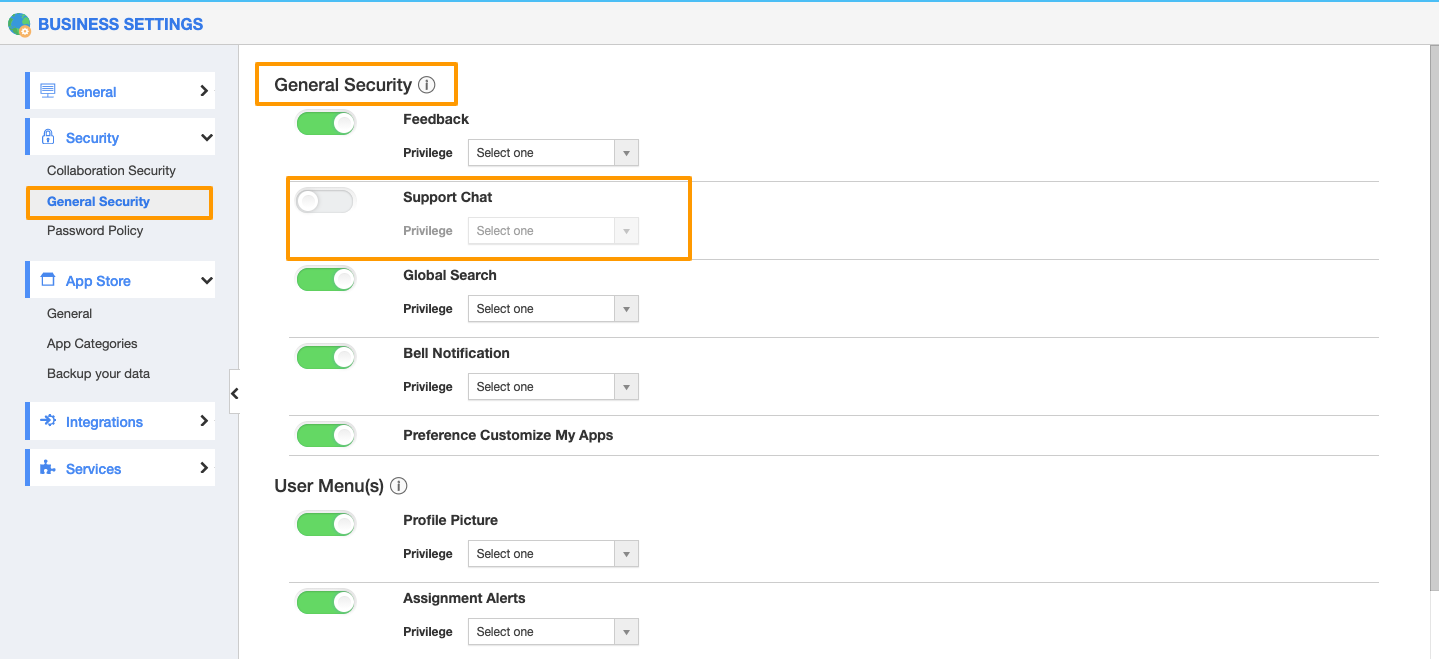 - Click "General Security" from the left navigation panel. Enable the "Support Chat" toggle.