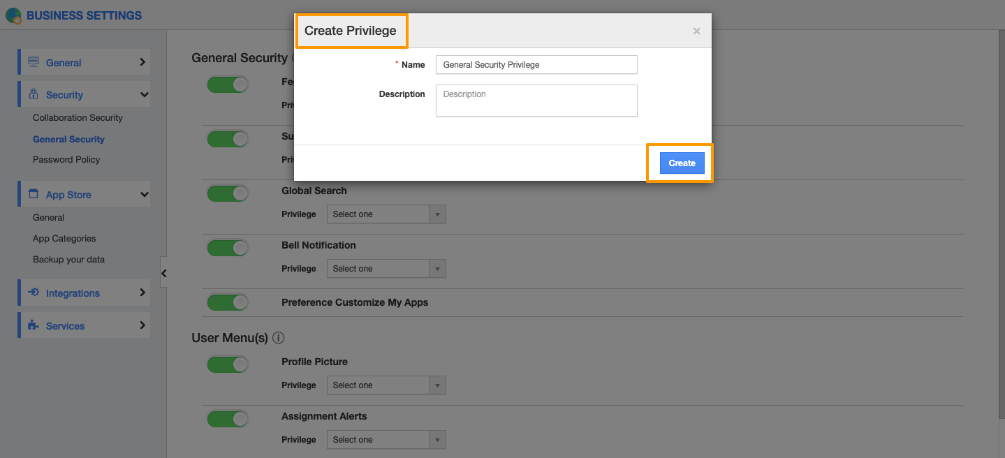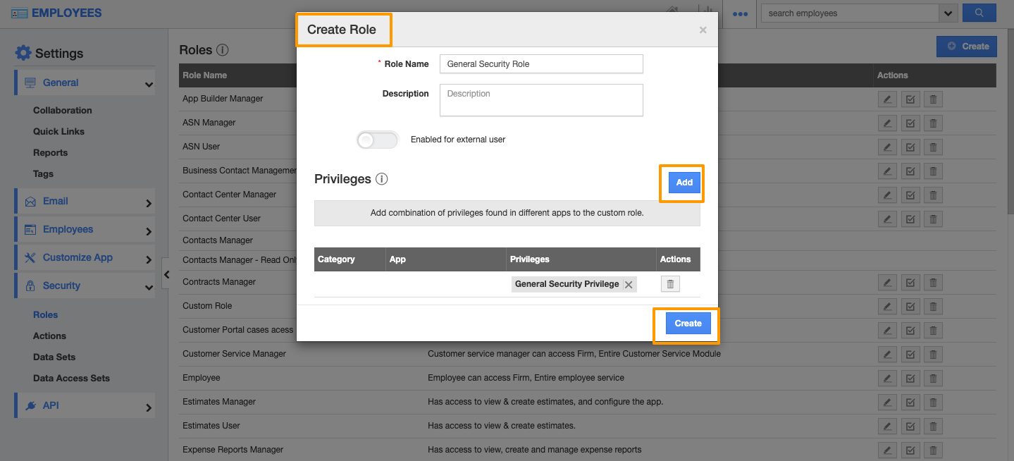 - Select “General Security Privilege” and click on the “Create” button to save privilege.
