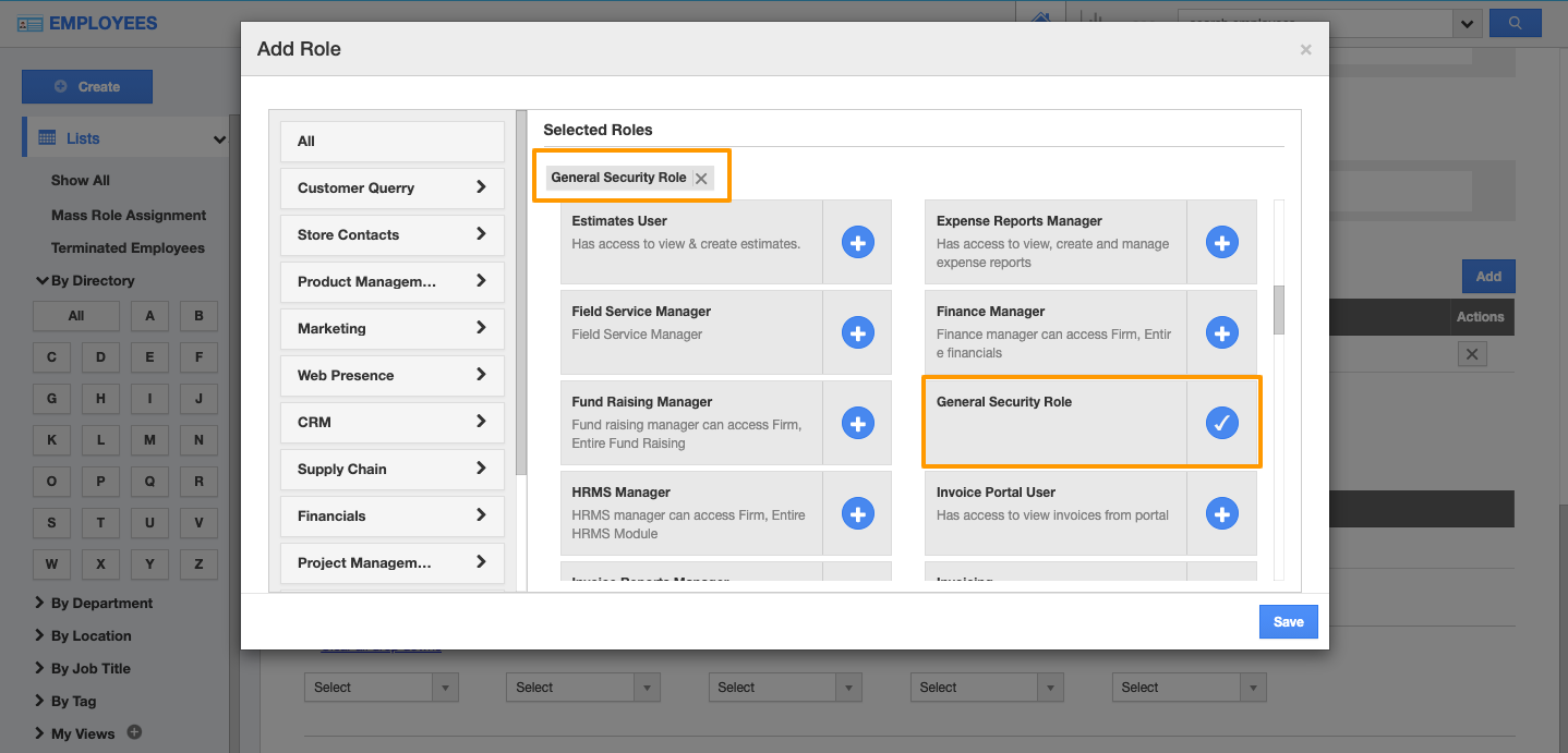 - On the Create Role popup, specify a “Role Name” as “General Security Role”.