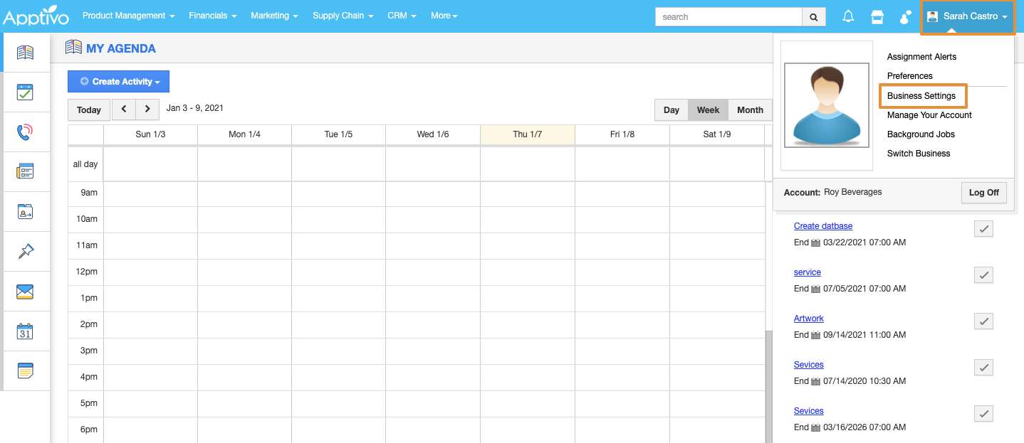- Click on the account name and select the Business Settings.