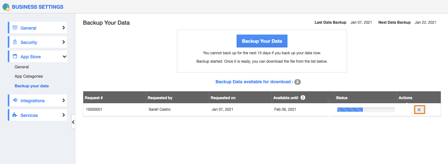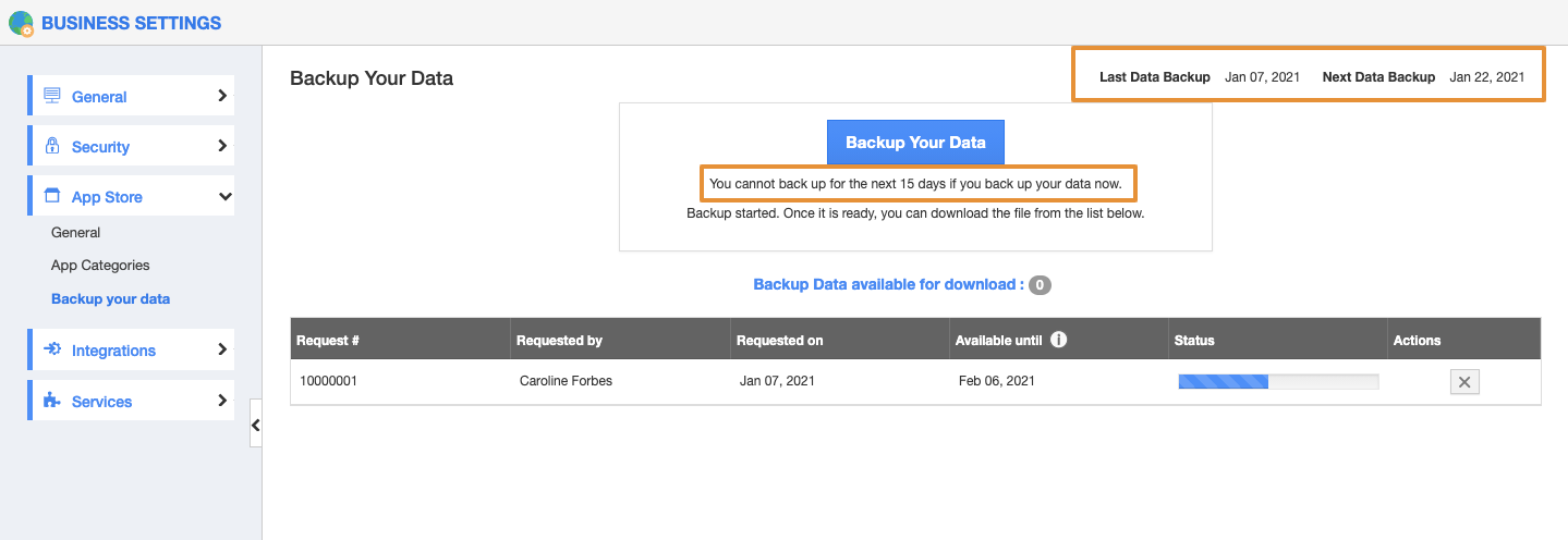 - On the Business Settings page, under the App Store settings click on the Backup Your Data.