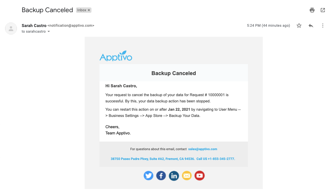 - Once the backup is canceled, you will be getting the email notification for backup is canceled.