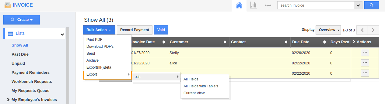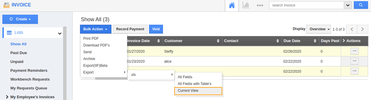 The bulk action option allows you to edit several invoices records simultaneously. You can export the invoices to an excel sheet. Let’s see how it's done. Here we go!