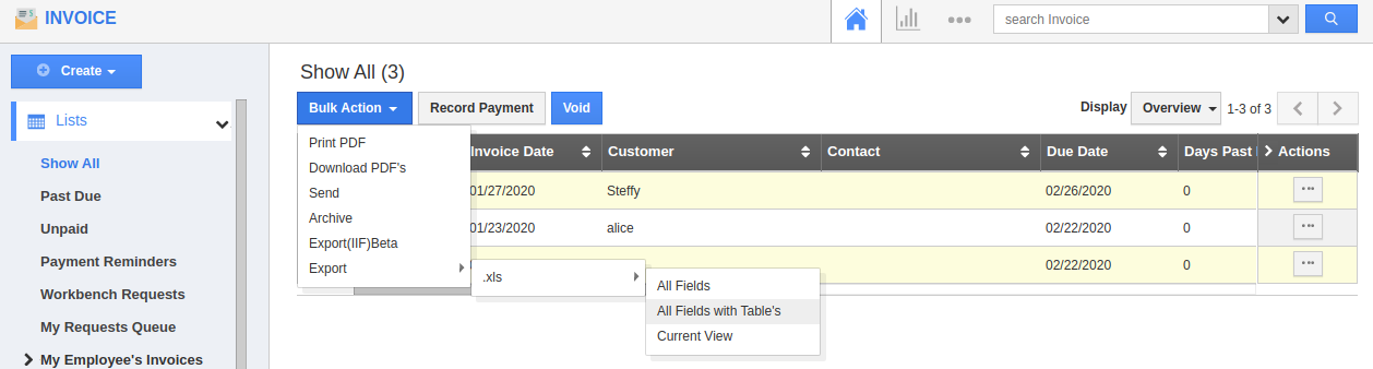 - Go to Invoices App → Show All → Select the records to be exported → Bulk Actions → Export.