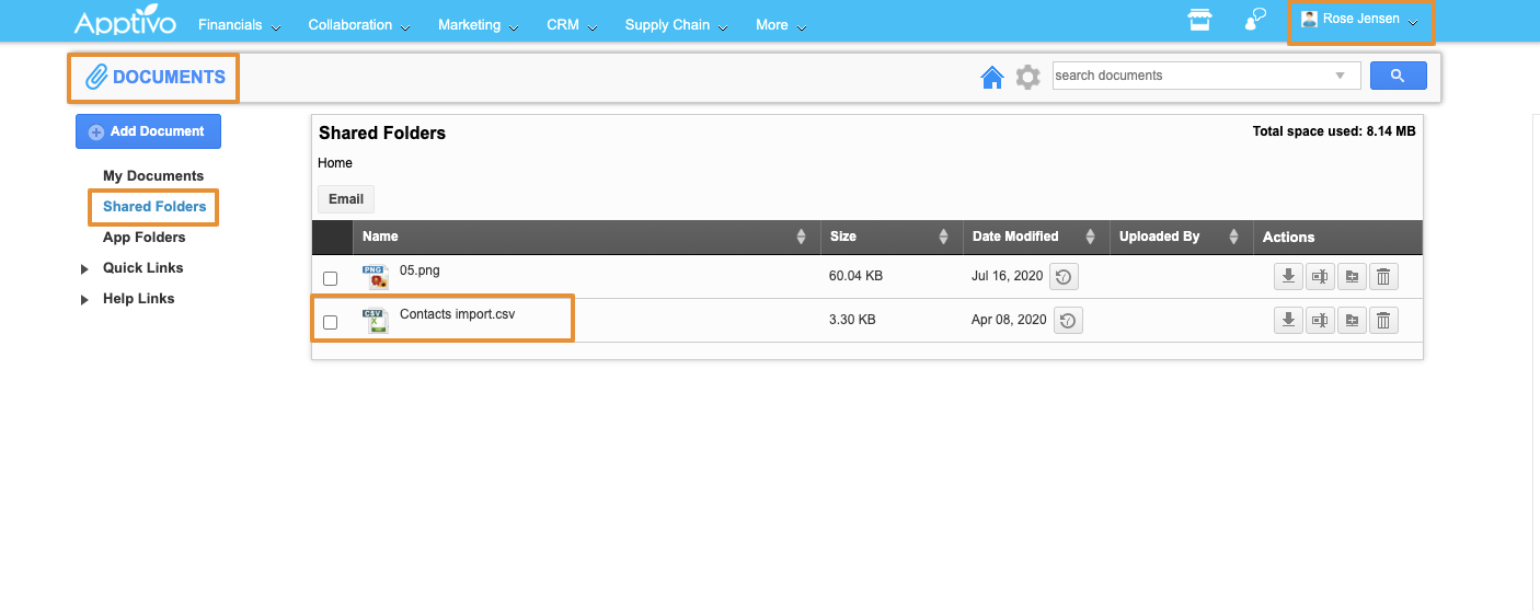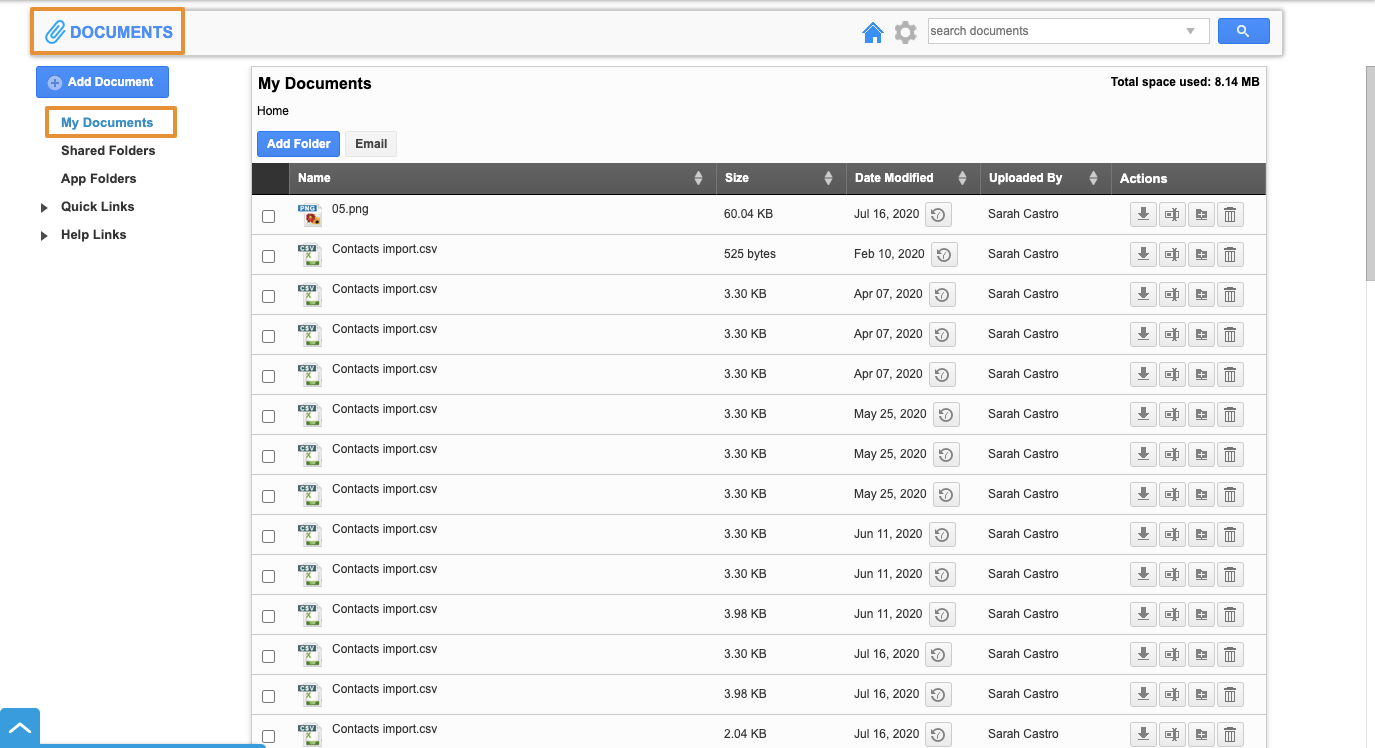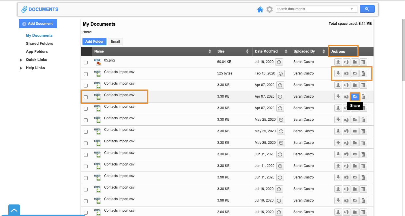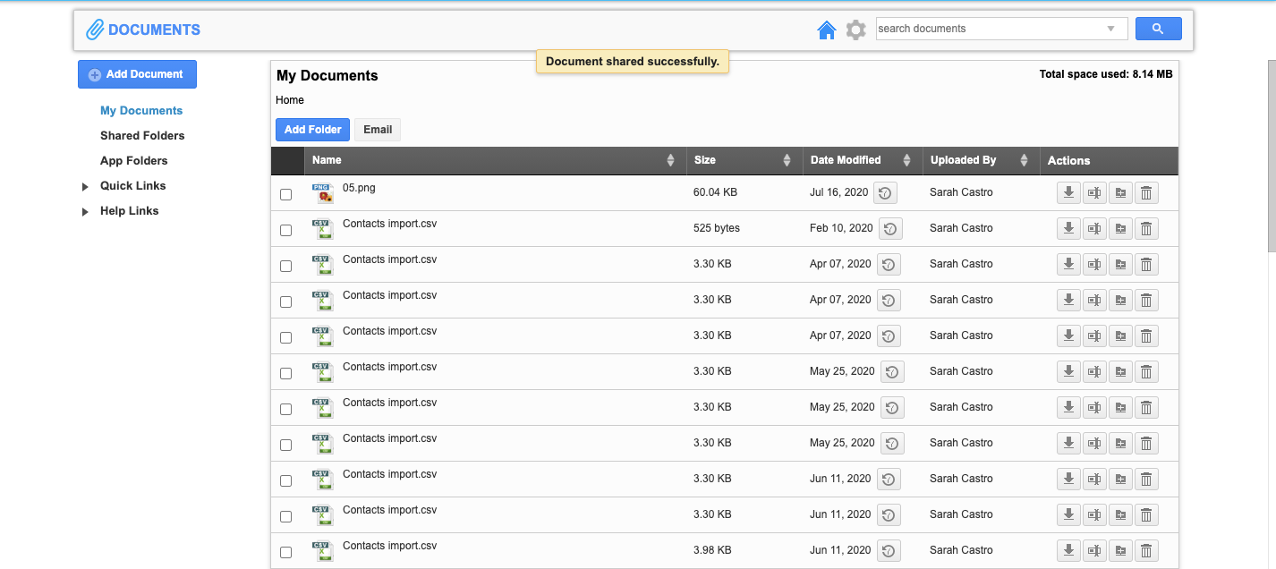 - You can view the document’s actions like Download, Rename, Share, and Delete under the Actions.
