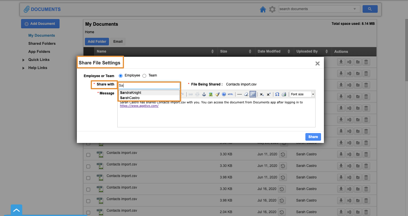 - Type the employee names first letter to get the lists of the employee starts with that letter on the Share With field.