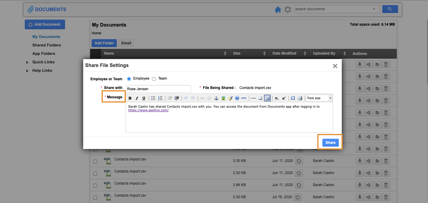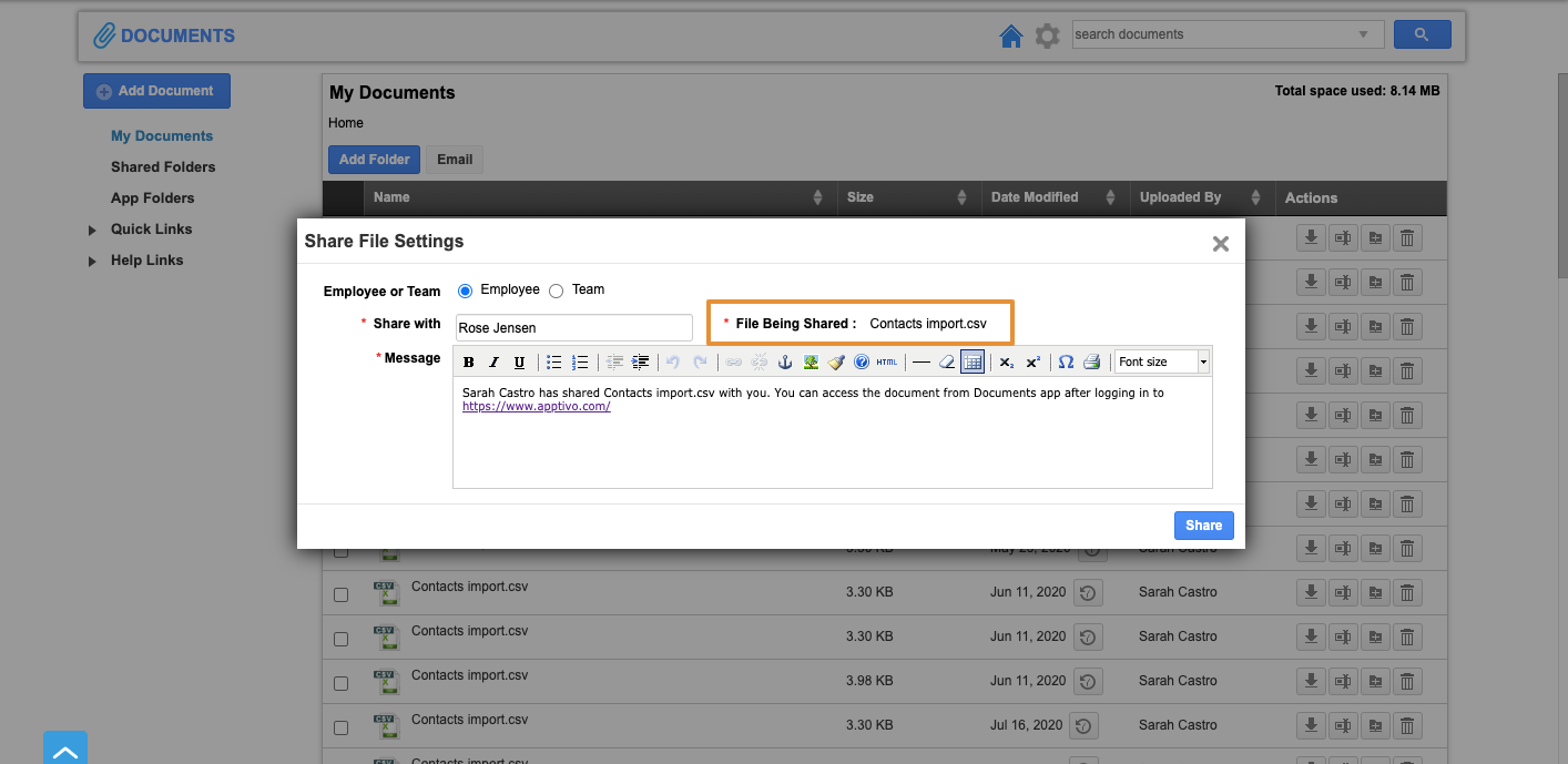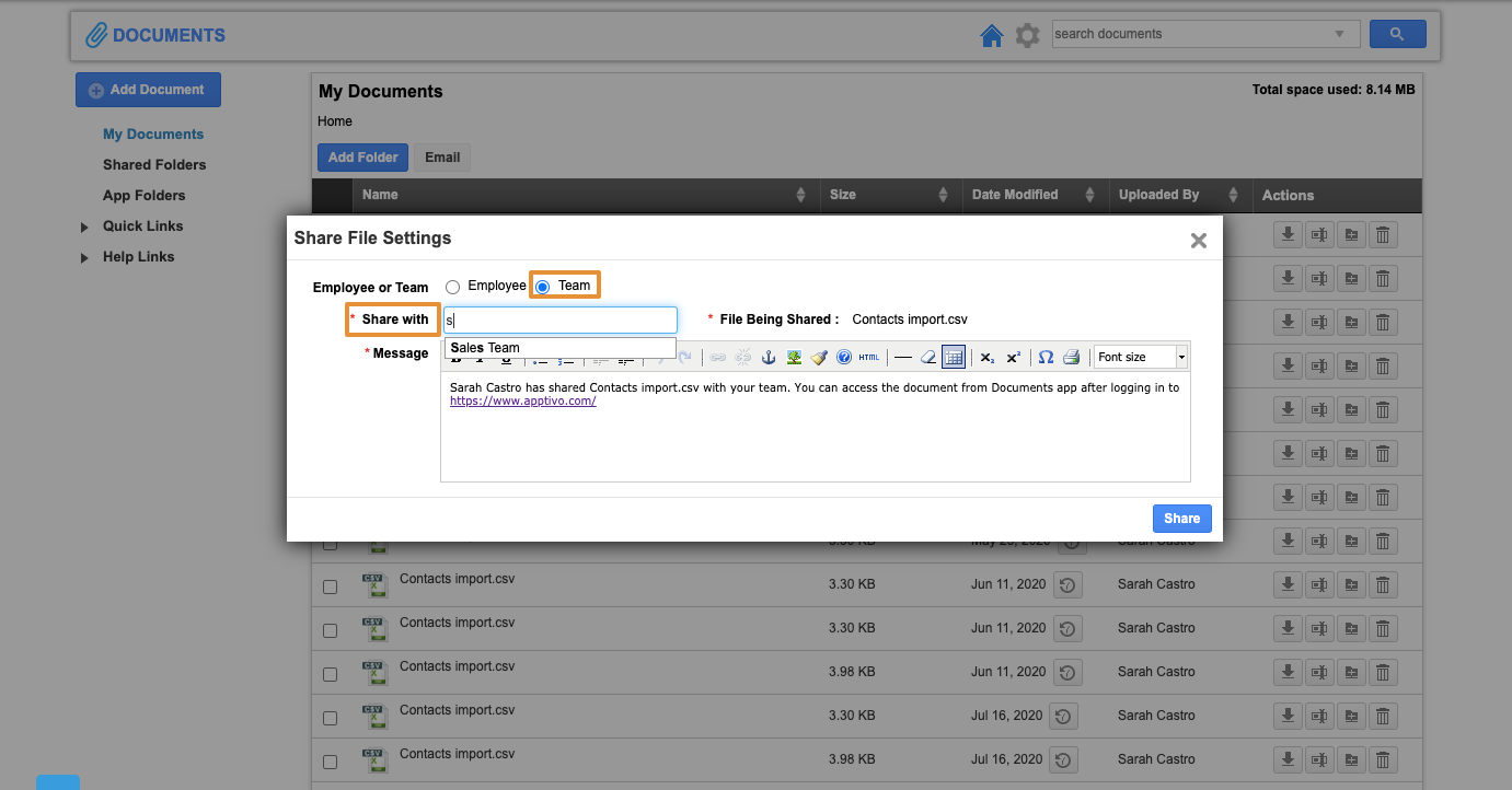 Sharing documents is very important, especially in an organization where restricted access to documents is unavoidable. You can also share this with the addition of a document to the Documents App.