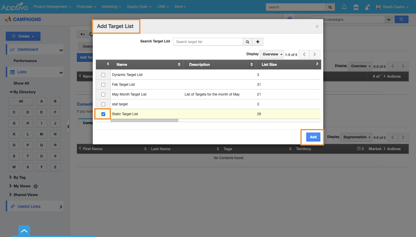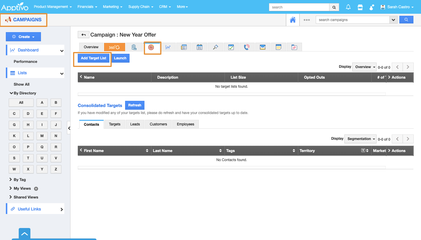 - Here, click on “Add Target List” to add the required targets (recipients) for the campaign.