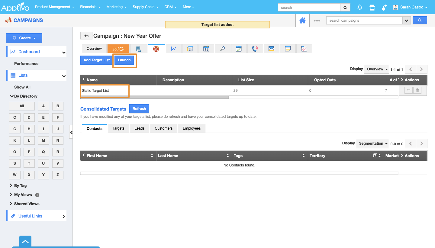 In order to Launch a Campaign, firstly, you need to add the Target List into the campaign. This allows you to launch the campaigns in bulk to the target size.