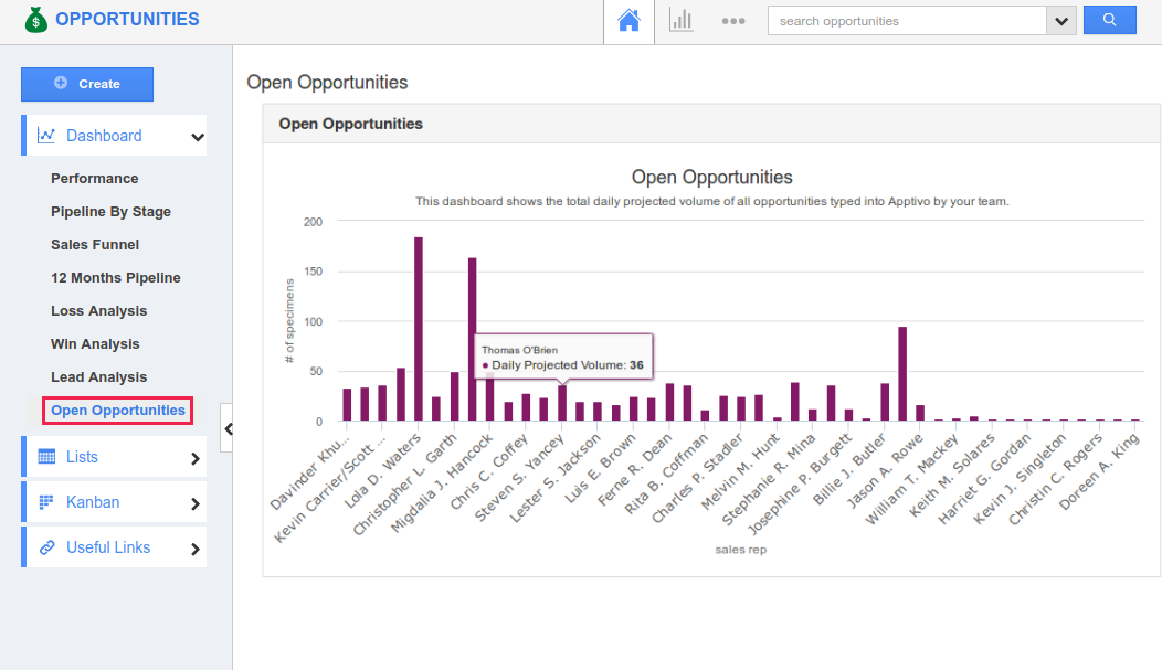 The above-created dashboard can be viewed from the homepage of the Opportunities App, as shown in the below image: