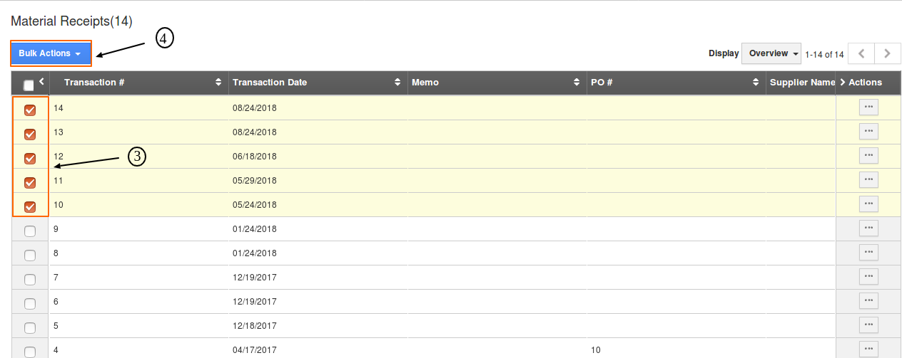 - Select the Bulk Actions button and navigate to Export → .csv → All Fields to export the receipts