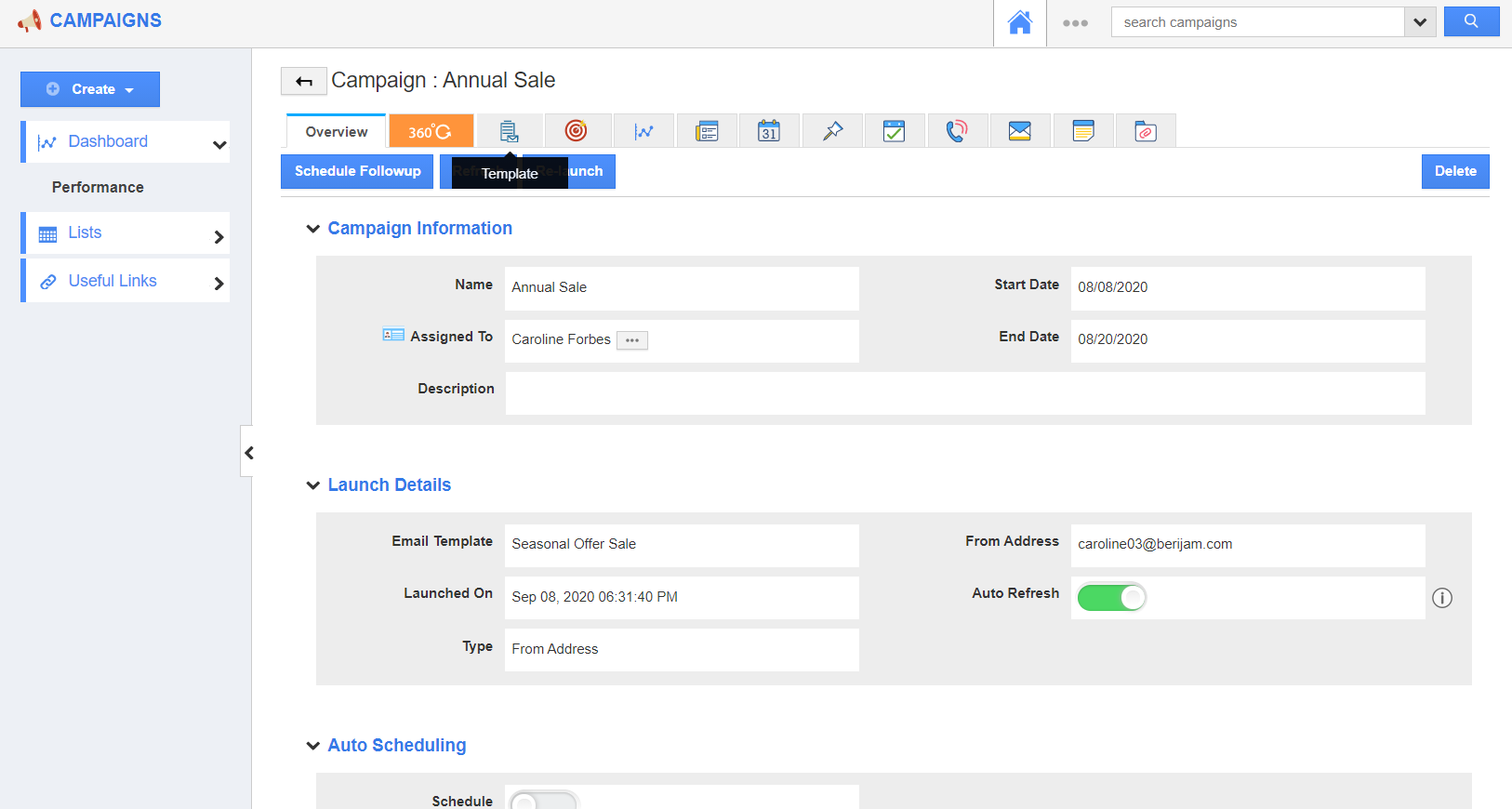 - Navigate to the Overview page of a campaign. Here, select the Template tab from the Activity Bar.