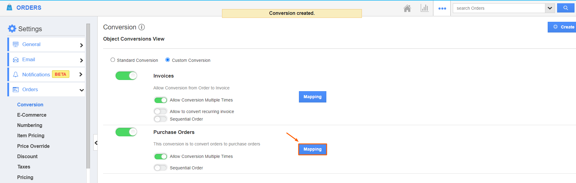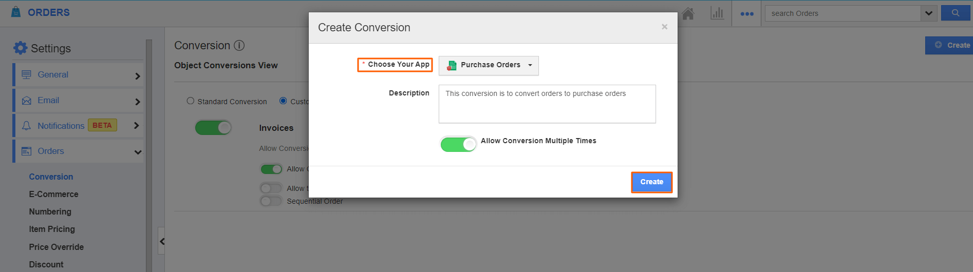 - Once you select the app, the conversion will get created. By enabling Allow conversion multiple times, You can convert the same order into a purchase order multiple times. If you disable the Allow conversion multiple times, then you can perform conversion only once.