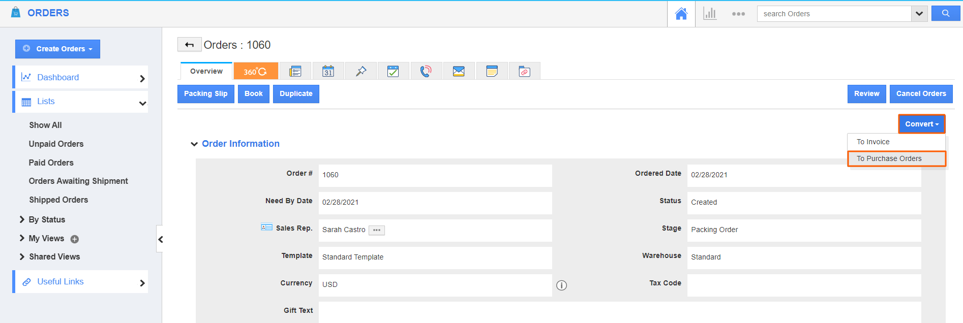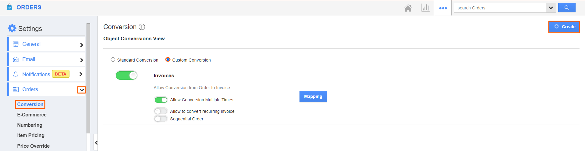 You can create and manage your orders within Apptivo! By using Custom Conversion, you can convert the orders to other records. This feature helps you to save time by allowing you to predefine the fields through mapping and proceed with the conversion in less time.