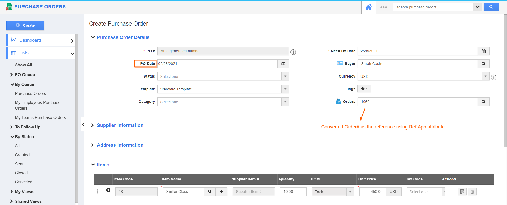 - You will be directed to the Purchase Orders app and you can see the mapped values auto-populated along with the saved reference objects as shown below.