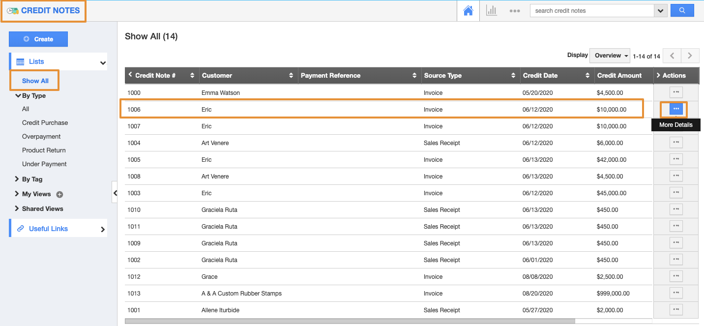 - Click on "Show All" to view all the Credit notes.