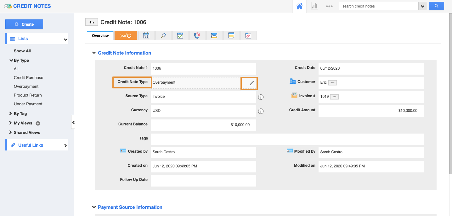 - Hover the mouse pointer on the field you want to edit so that you will be able to view the Edit icon. For instance: Credit Note Type.