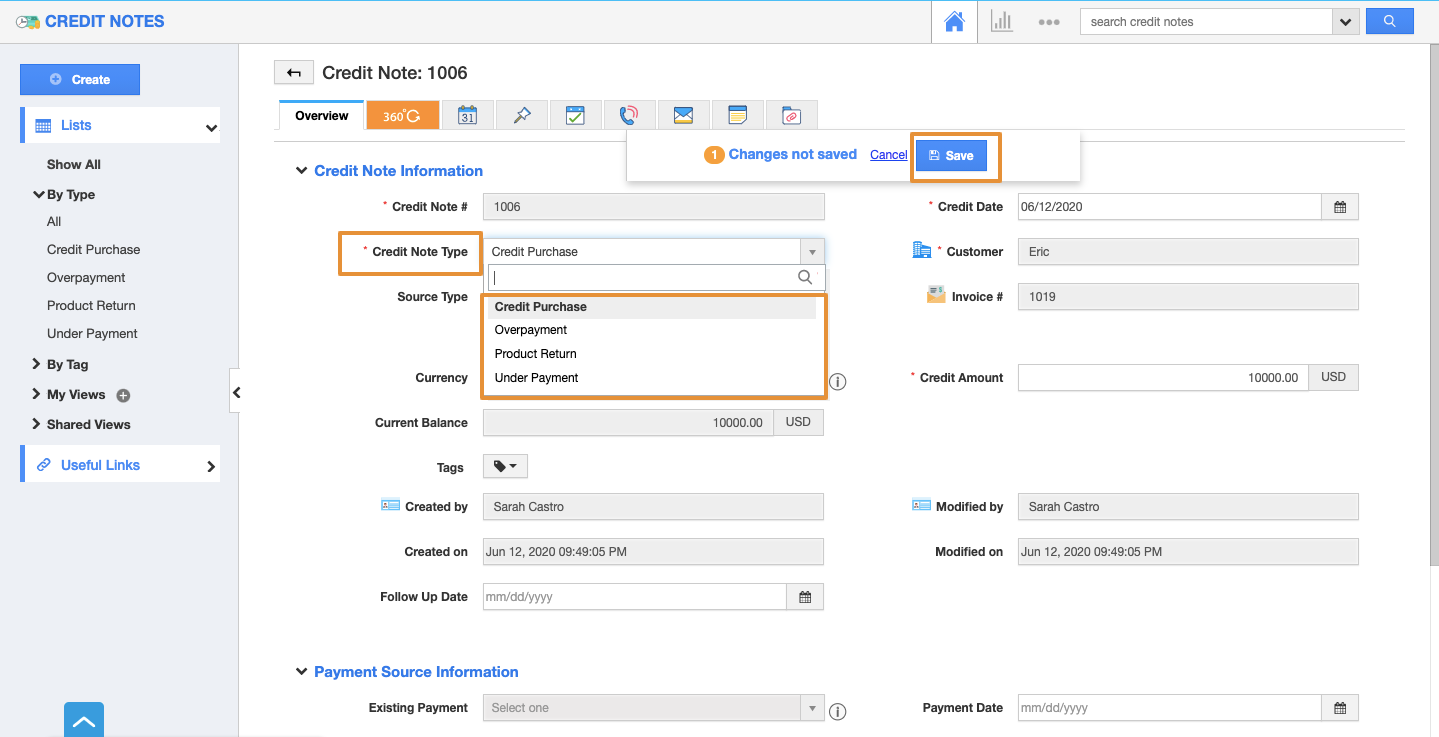 Overpayment: If your customer makes an advance payment to you, then you can create and maintain as an overpayment credit note. So this amount can also be applied when creating invoices or sales receipts.